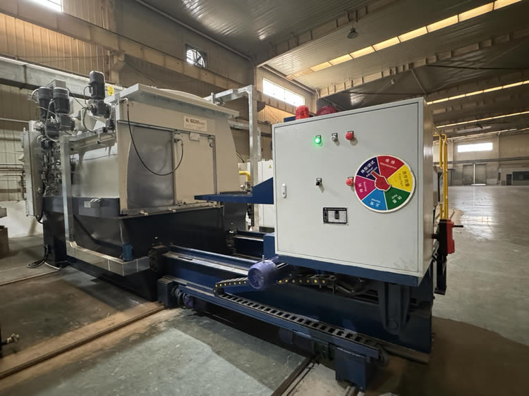 4、回火裝爐:瀝水完成后——料筐轉(zhuǎn)移到回火爐爐口——爐門開啟——中轉(zhuǎn)車把工件送入回火爐膛——中轉(zhuǎn)車自動退出——爐門關閉——裝爐工作完成。