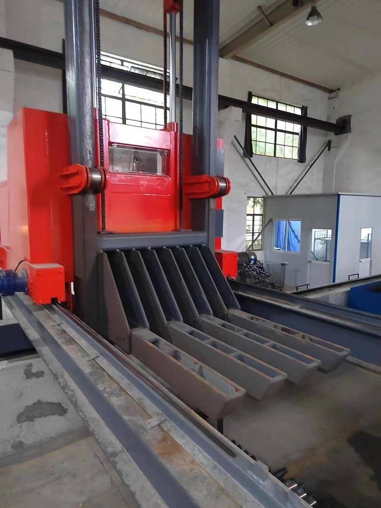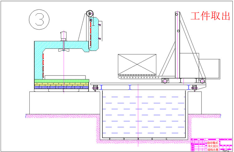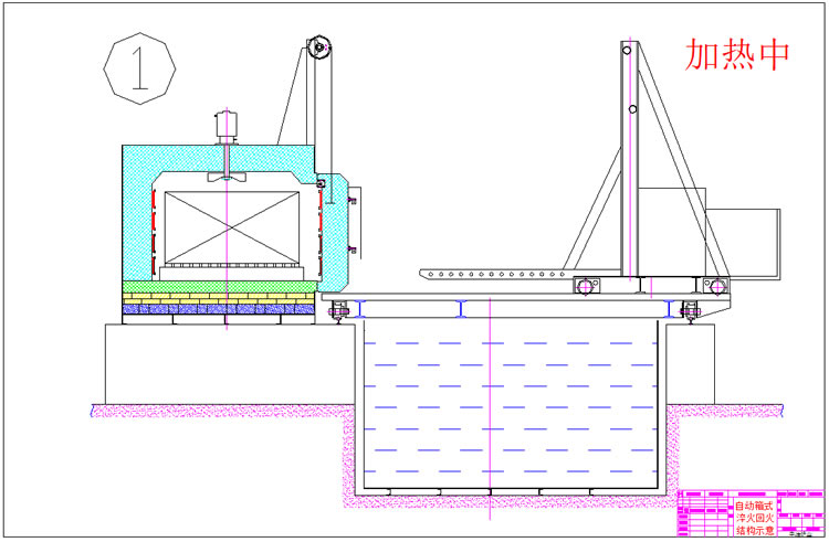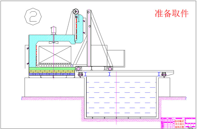 3、出爐淬火:按動出爐按鈕——中轉(zhuǎn)車移動到淬火爐爐口——爐門開啟——中轉(zhuǎn)車把工件移出爐膛——中轉(zhuǎn)車后退——升降叉下降,工件進入淬火介質(zhì)——中轉(zhuǎn)車帶動工件在水中左右擺動(次數(shù)可調(diào))——中轉(zhuǎn)車上升瀝水——淬火工作完成