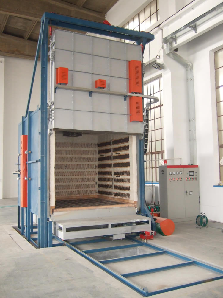 1、裝爐時(shí),臺(tái)車開出爐體,操作比井式爐方便;